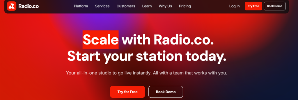 Radio.co allows broadcasters to run live radio stations from the cloud. Scheduling, live shows, and automation can all be managed without local studio equipment.