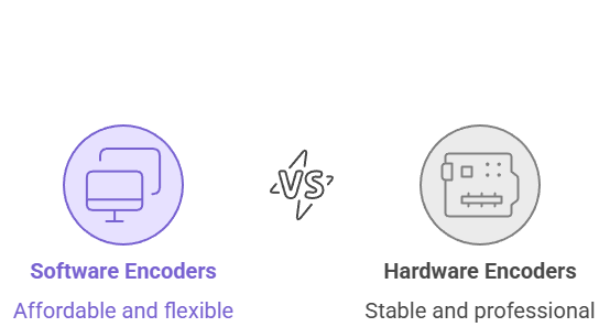 Before choosing an encoder, it helps to understand the difference between software encoders and hardware encoders. Both perform the same task of compressing and converting your video for streaming, but they work in different ways.