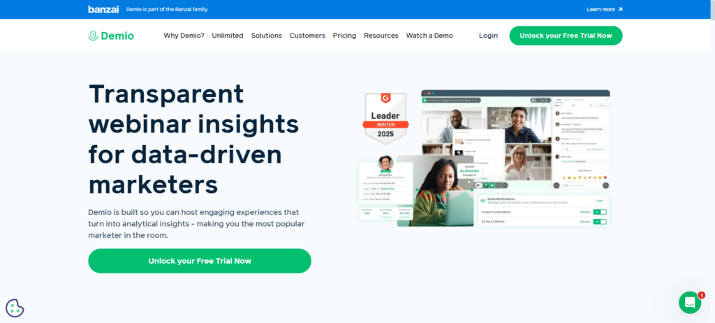Demio is built with marketers in mind, offering a simple and intuitive way to host live, scheduled, and series webinars. Since it’s browser-based, attendees don’t need to download anything, making it easy to join. It focuses heavily on engagement, with polls, branded registration pages, and automated email reminders. Demio pricing plans start at $45/month for 50 attendees and higher tiers available for larger groups.
