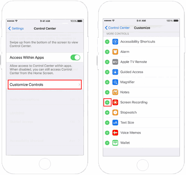 - Find Screen Recording and tap the green + button next to it